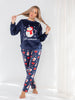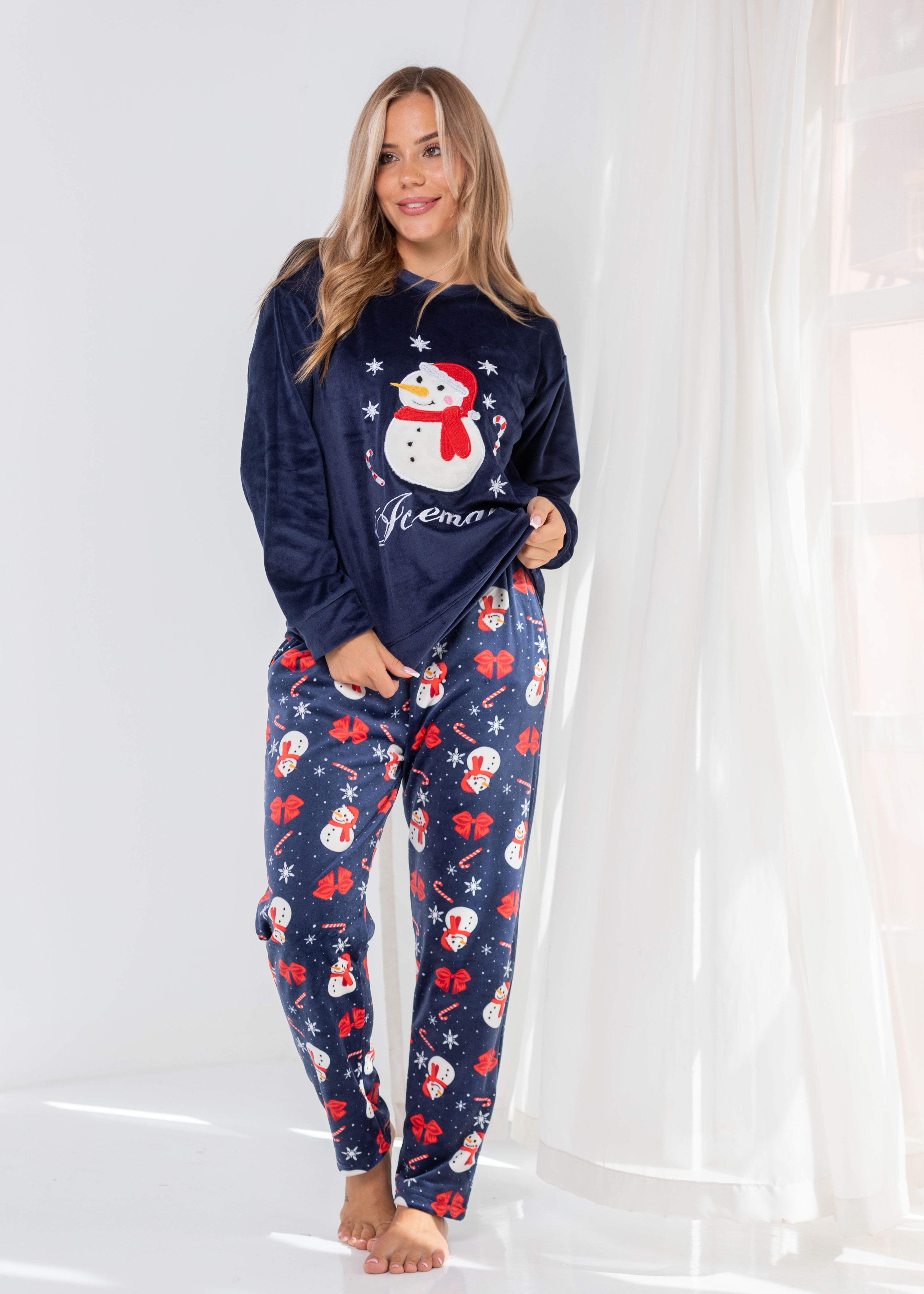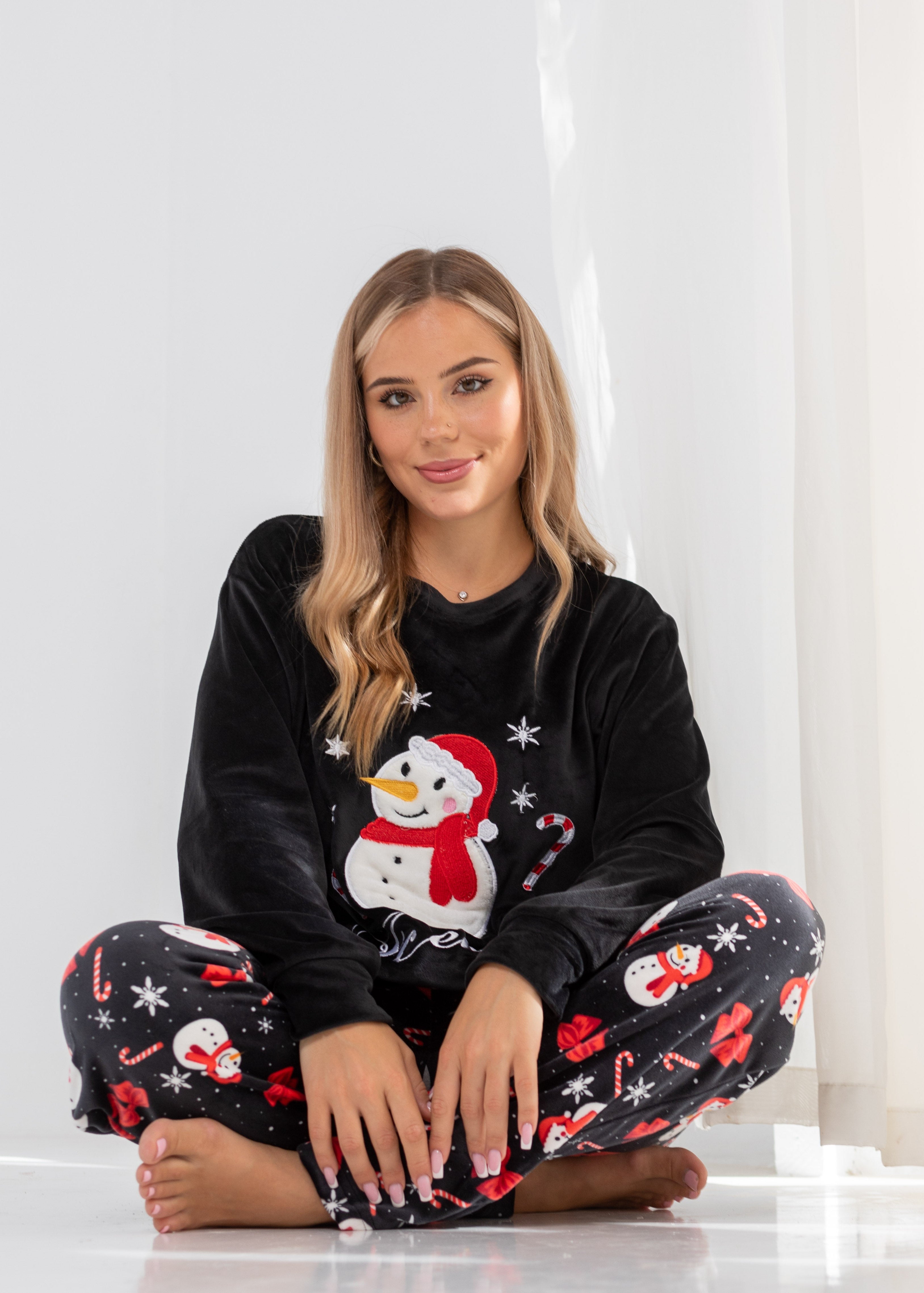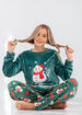 The set includes a green velvet long-sleeve top with a cheerful snowman print, and matching printed pants with a festive winter pattern — perfect for relaxing or gifting this season.