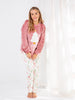 This adorable two-piece set includes a pink velvet long-sleeve top with an embroidered Christmas tree design, paired with white printed pants in festive winter patterns — perfect for lounging, relaxing, or gifting during the holidays.