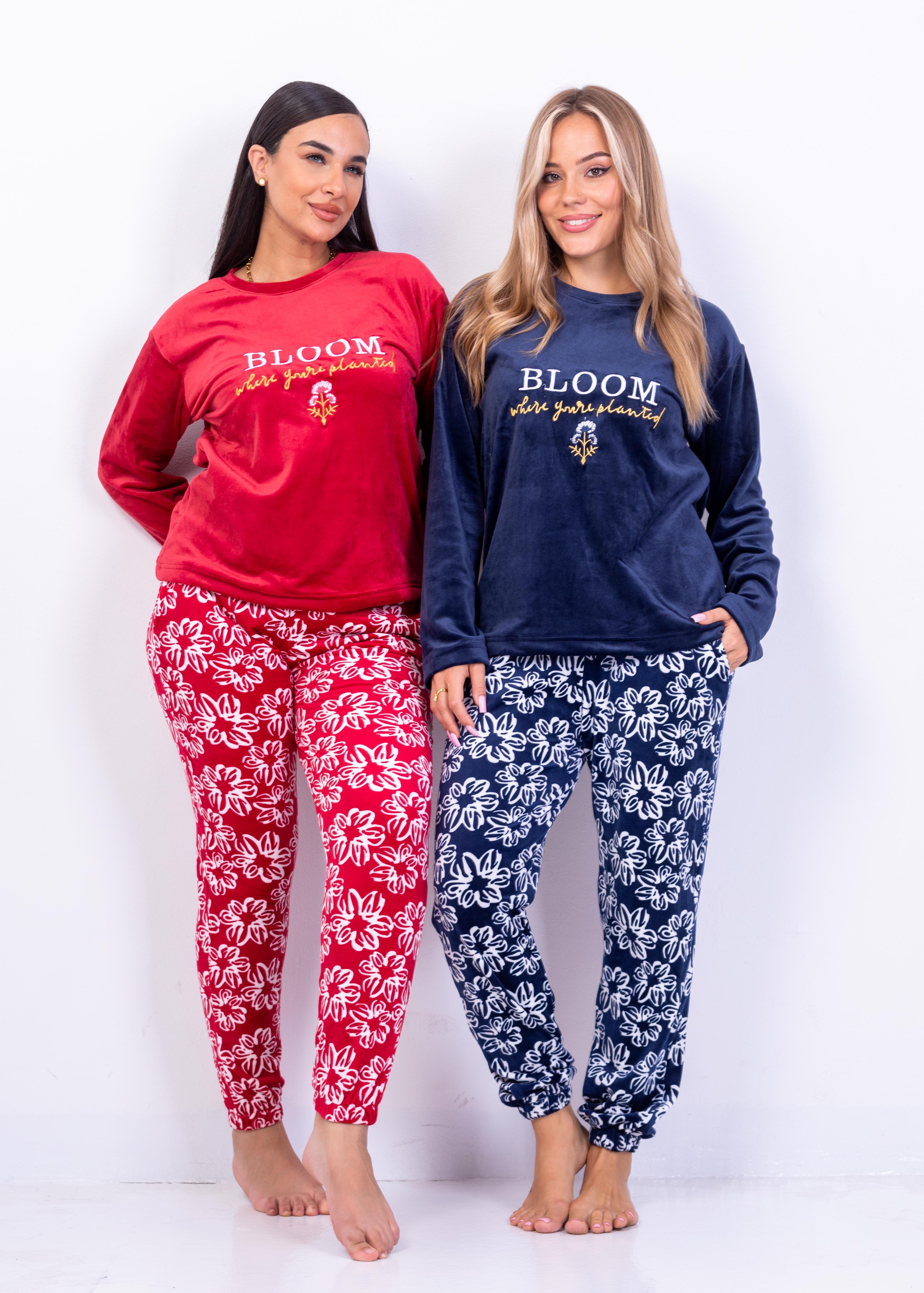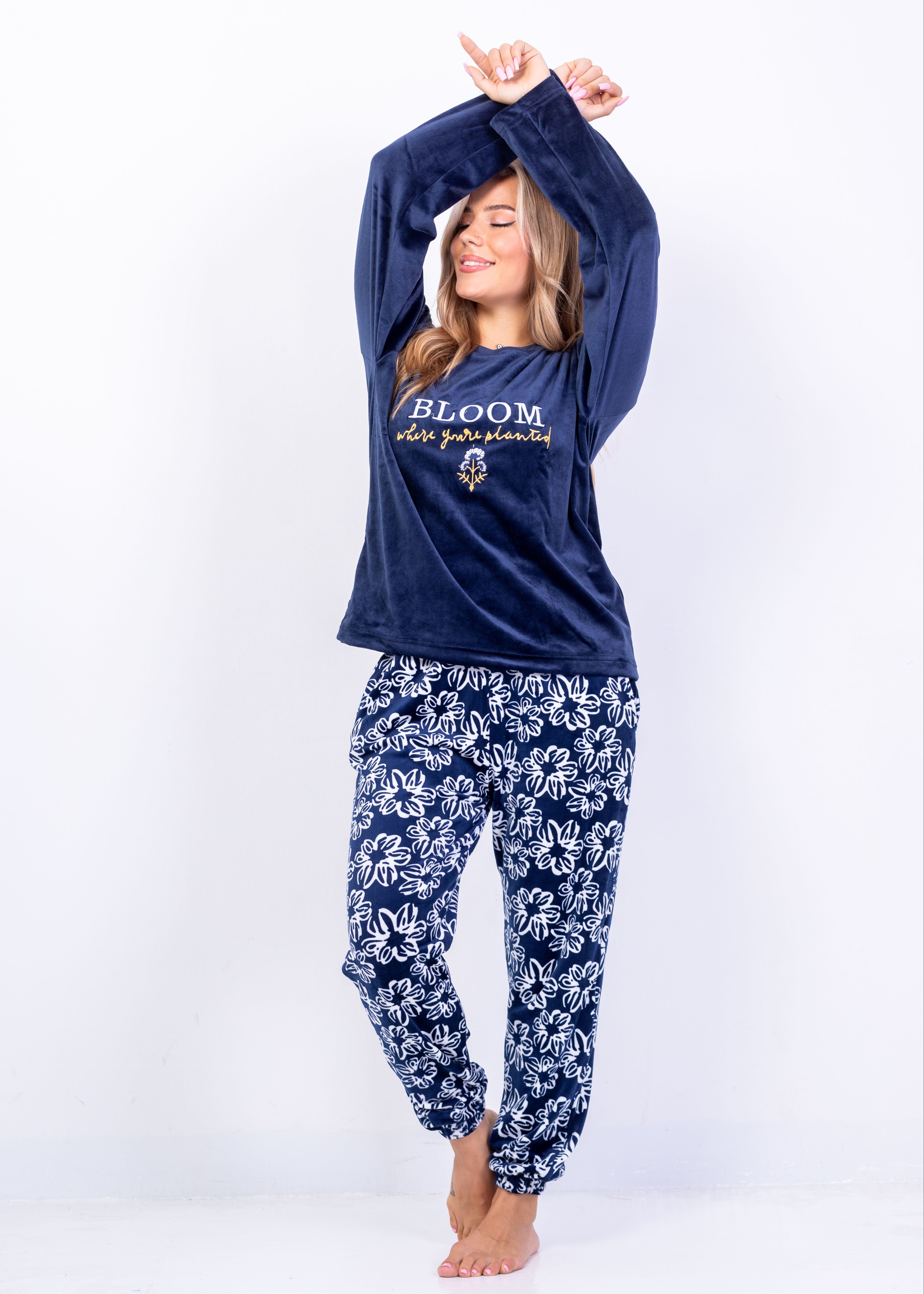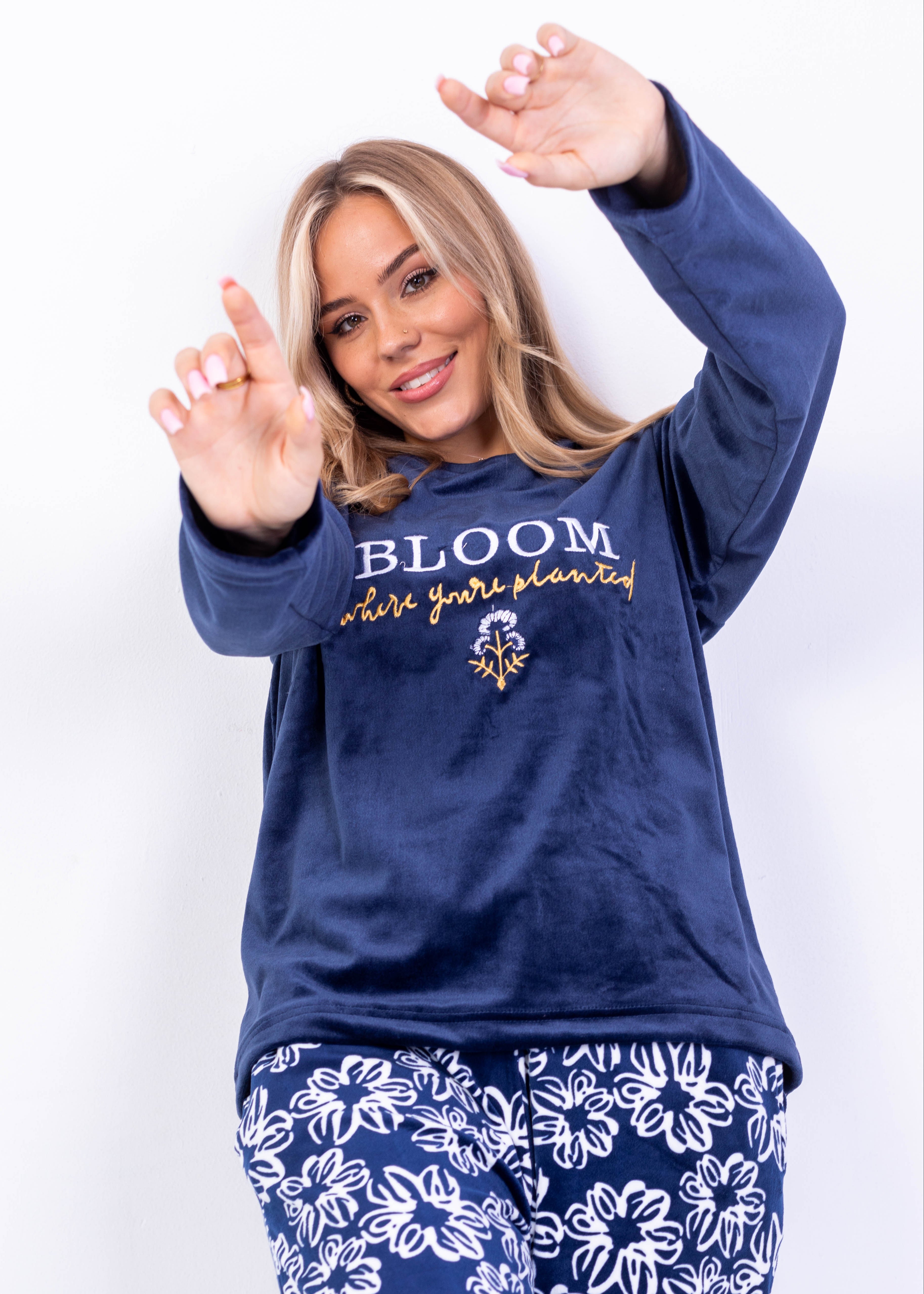 Made from soft navy velvet and paired with floral printed pants, it’s your go-to winter homewear for warmth and effortless charm.