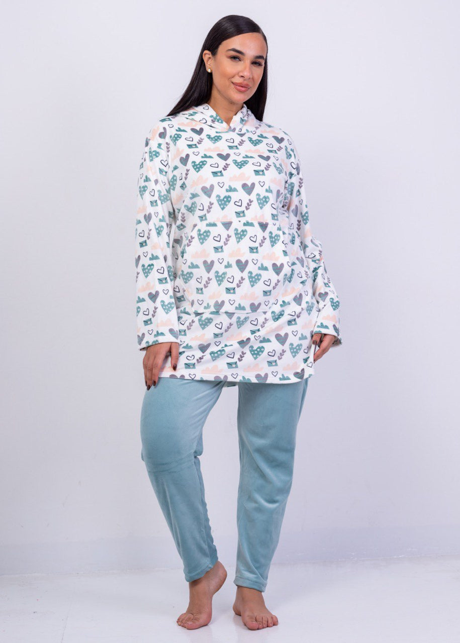 • Two-piece pajama set (hoodie top + velvet pants)